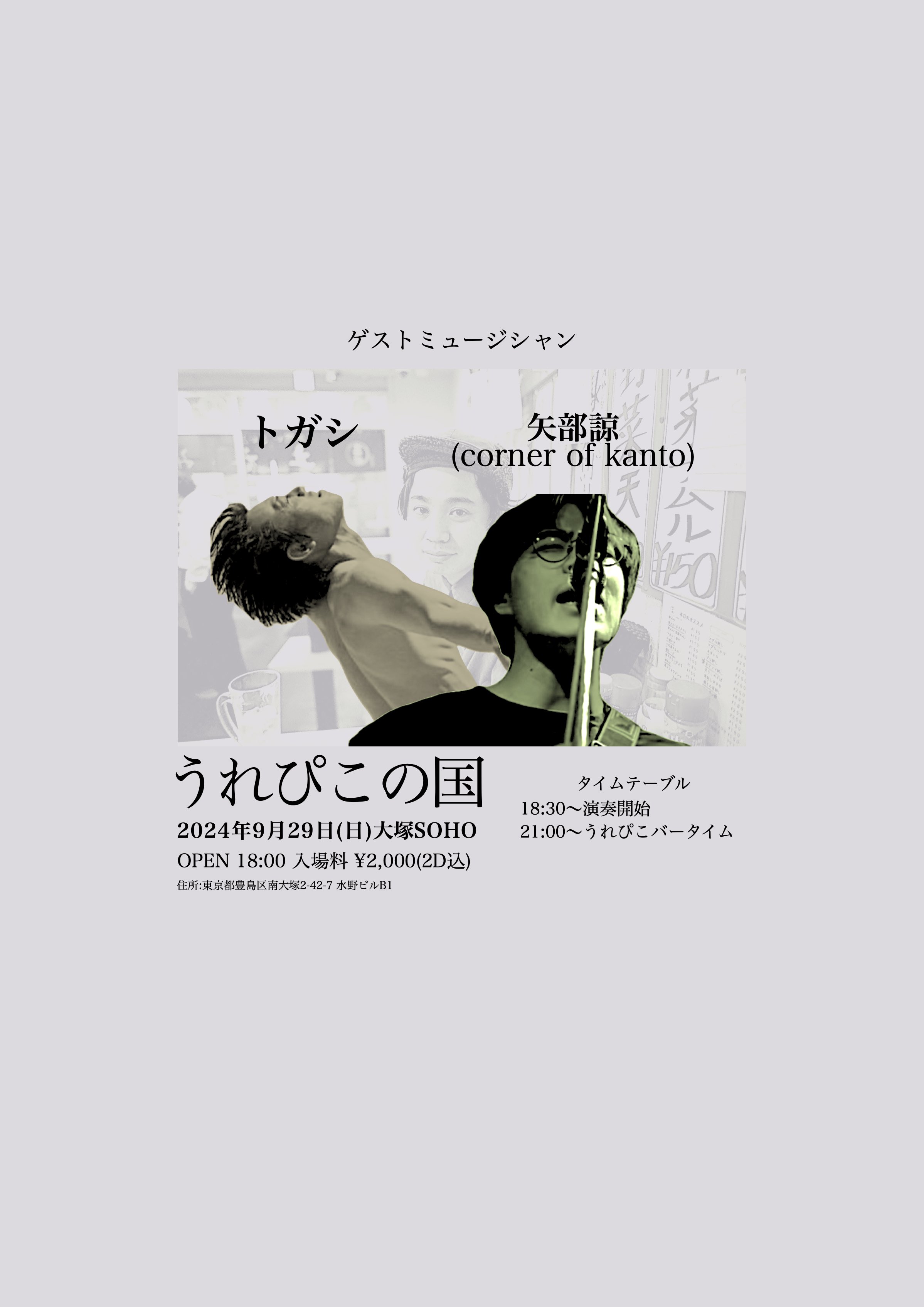 出演者 たいち(oh yes aha、ダンジョングループ) トガシ 矢部諒(corner of kanto) OPEN 18:00 / START 未定 ¥2000(2Drink込み)