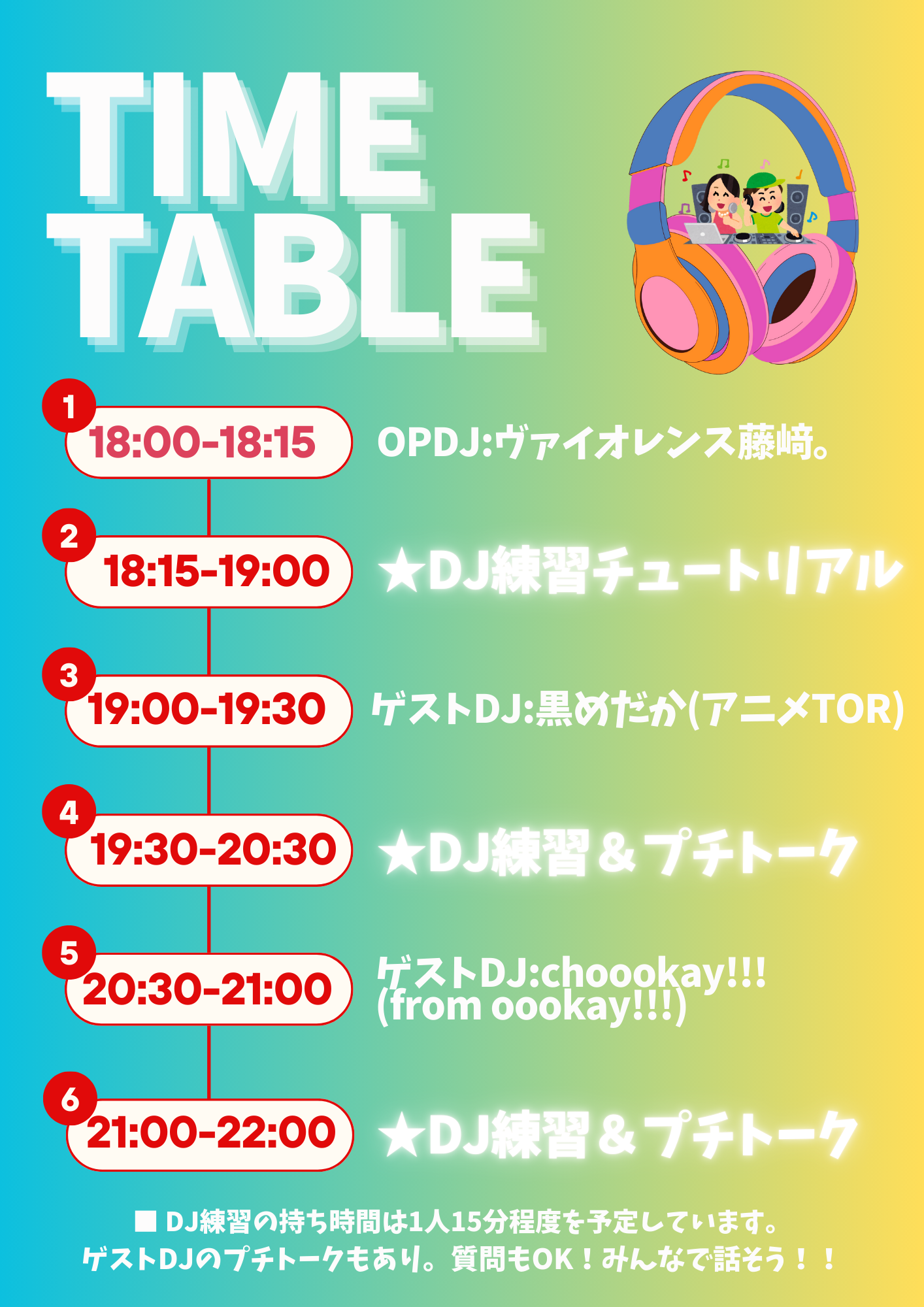 出演者 進行&DJ : ヴァイオレンス藤﨑。(ex.sunnysider) ゲストDJ:黒めだか(アニメTOR) / choookay!!!(from oookay!!!) OPEN 18:00 / START 18:00 入場料 ¥3,000 (3ドリンク または 1ドリンク+1フード)